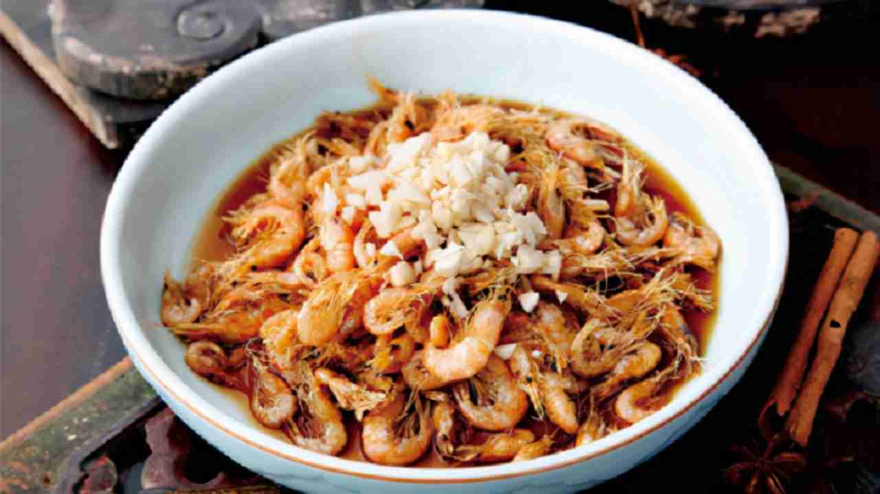 食材:鲜虾300克、酱油、醋、姜丝、花椒、葱片适量。