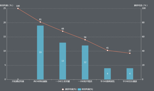在vivoY33s上最大的亮点,就是它所搭载的5000mAh超大容量的电池了,为了检验它的实际续航能力,我们也进行了一轮5小时重度续航测试,在5小时里分别进行了两小时B站视频、一小时《王者荣耀》、一小时《和平精英》、半小时微博浏览以及半小时音乐播放,经过实测得到的续航数据如下图所示: