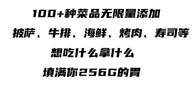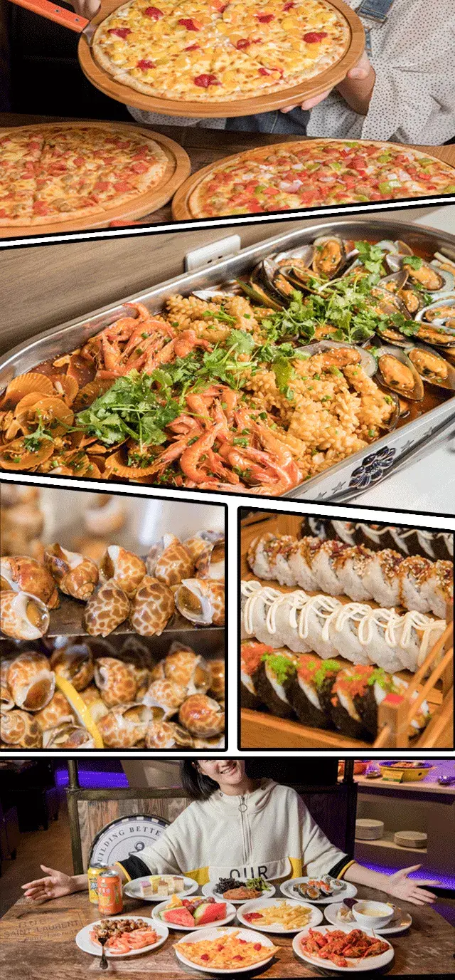 在这里披萨、海鲜、烧烤、牛排...一应俱全,都是你的!还不带上你256G的胃,放肆吃?!