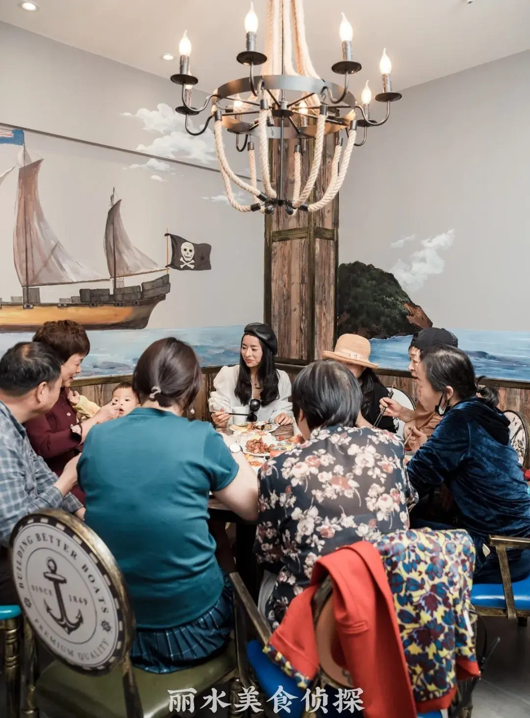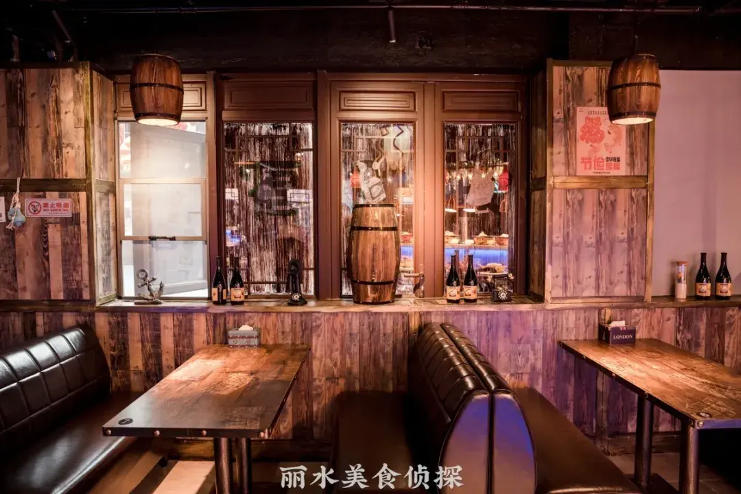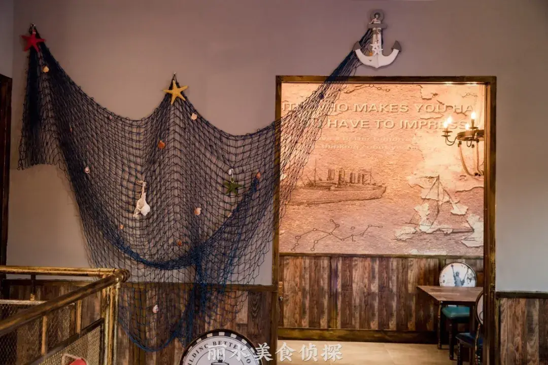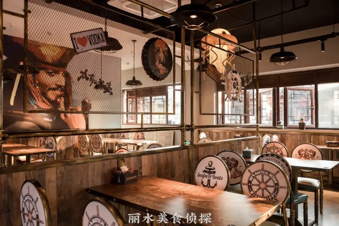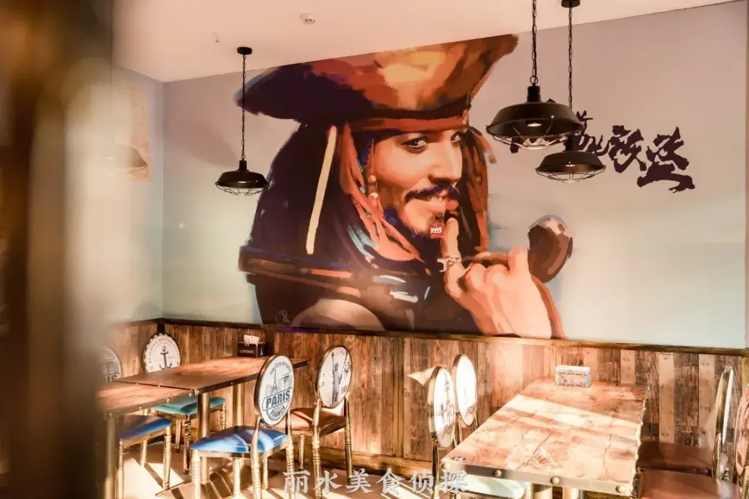 满船木元素的装修风格,让人仿佛置身于当时的情景中,就连座位上都是海盗元素的图案