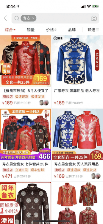在某宝上搜索关键词寿衣,款式、颜色、价格乃至销量,都全方位多角度超出了我的预想。