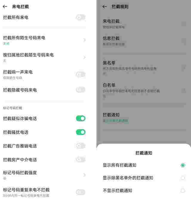 当然,如果你不放心,害怕错误拦截,可以在拦截通知中设置显示所有拦截通知,以便于自己做出调整,不漏掉重要的来电。
