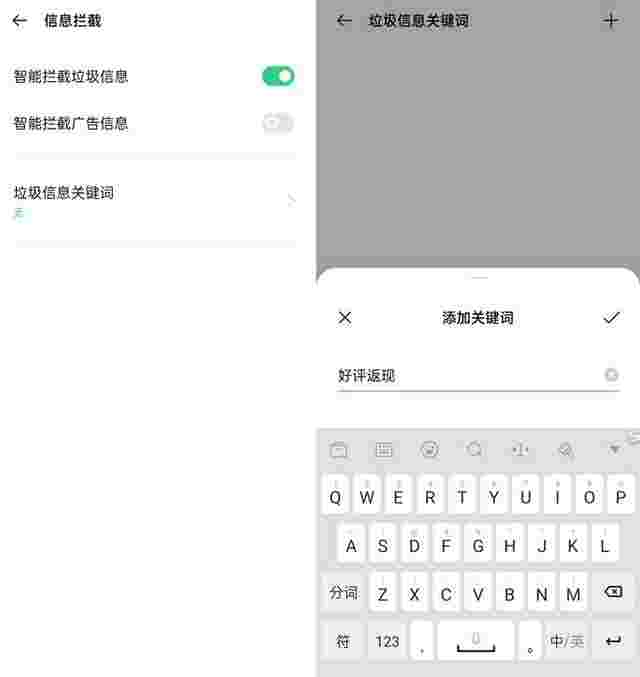 点击右上角+号,输入好评返现兼职等关键词,之后系统就会自动拦截携带关键词的信息,这样那些进入黑名单也无法阻止的垃圾短信,就可以被智能拦截,非常实用。