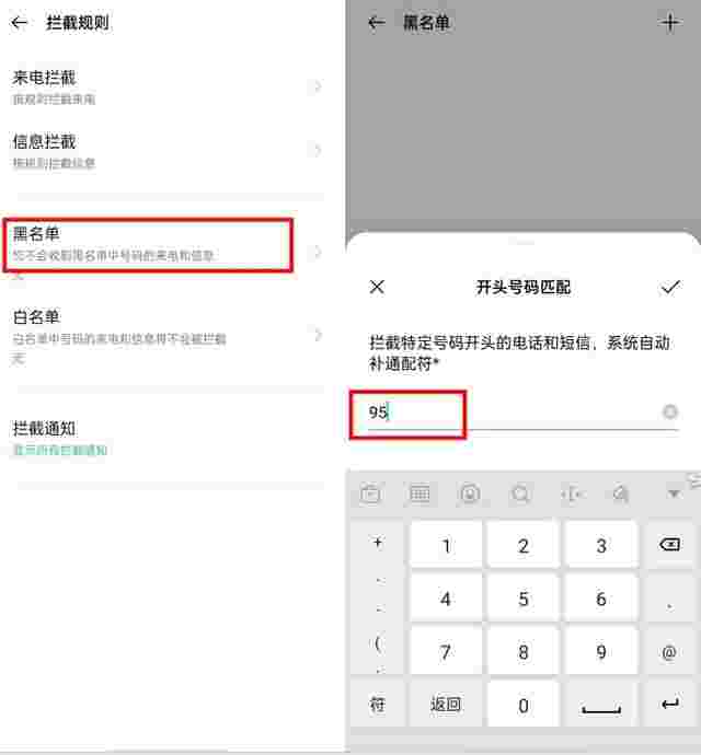 这里会看到三个选项,一是手动输入号码,指的是已确定的骚扰电话拦截;二是开头号码匹配,指常见的以95或者400开头的骚扰电话拦截;最后一个是则手动选择号码,针对已经接通过的骚扰电话。以开头号码匹配为例,输入公认的骚扰电话开头号码,系统就会智能进行拦截了。