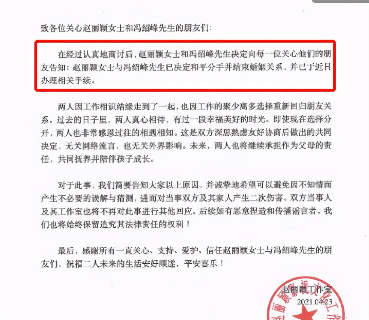 4月23日,赵丽颖工作室官宣了一条爆炸性的消息:赵丽颖和冯绍峰离婚了!网友们纷纷表示太突然了,虽然两人近来互动不多,但突然官宣离婚也让网友们大呼不敢相信。