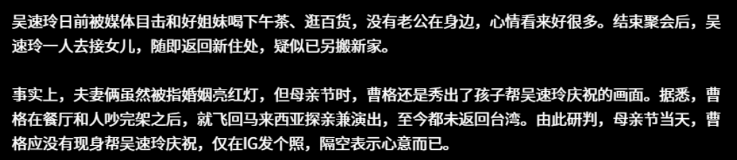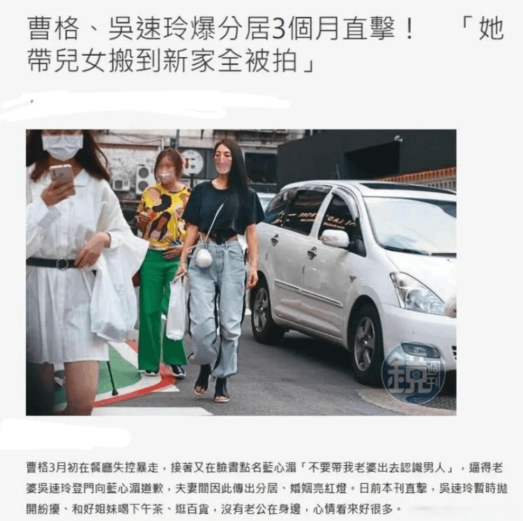 在接到一儿一女后开车又去了另一处住宅,很明显这不是他们夫妻二人共同居住的豪宅,以此推断,吴速玲可能与曹格分居。