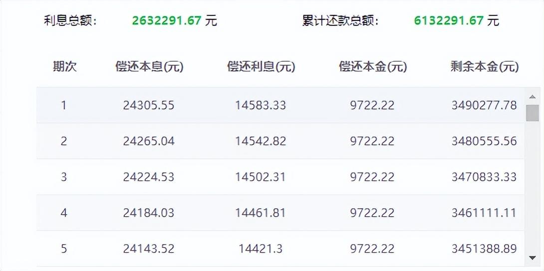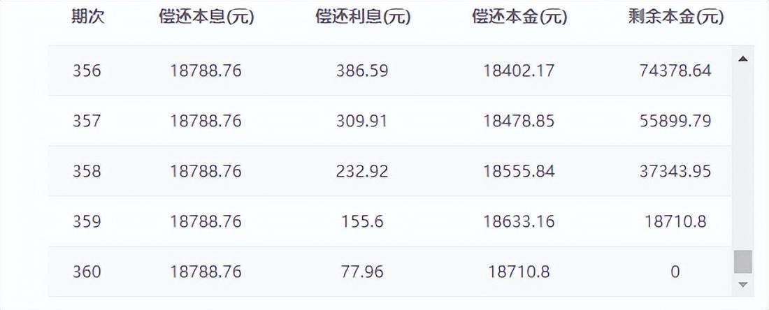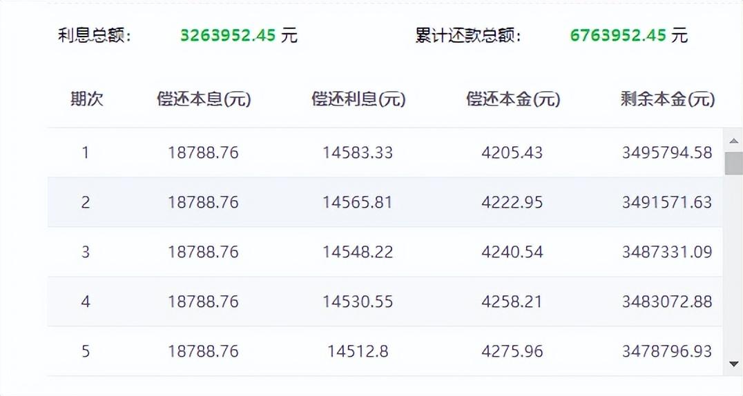 在350万贷款,5%年化利率和30年还款期限的前提下,平均每个月我们需要偿还的本息总额是18788.76元。但是通过计算器可以得知,我们第一个月实际偿还的本金是4205.43元,而所持有本金就是350万-4205.43=3495794.57元,利息则是14583.33元。但在最后一期,我们所偿还的本金是18710.8元,而利息仅有77.96元。