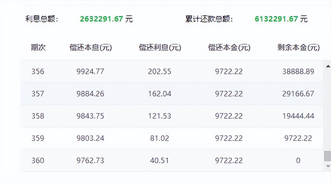 而等额本金,通过计算可得出,每个月的偿还本金固定9722.22元,而利息随着持有本金的减少,从14583.33到最后一期只有40.51元。