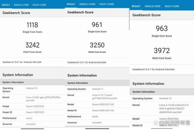 GeekBench中,搭载天玑8100的真我GTNeo3单核分数为963分,多核分数为3972分;搭载骁龙888的小米11单核分数为1118分,多核分数为3242分;搭载骁龙870的RedmiK40单核分数为961分,多核分数为3250分。