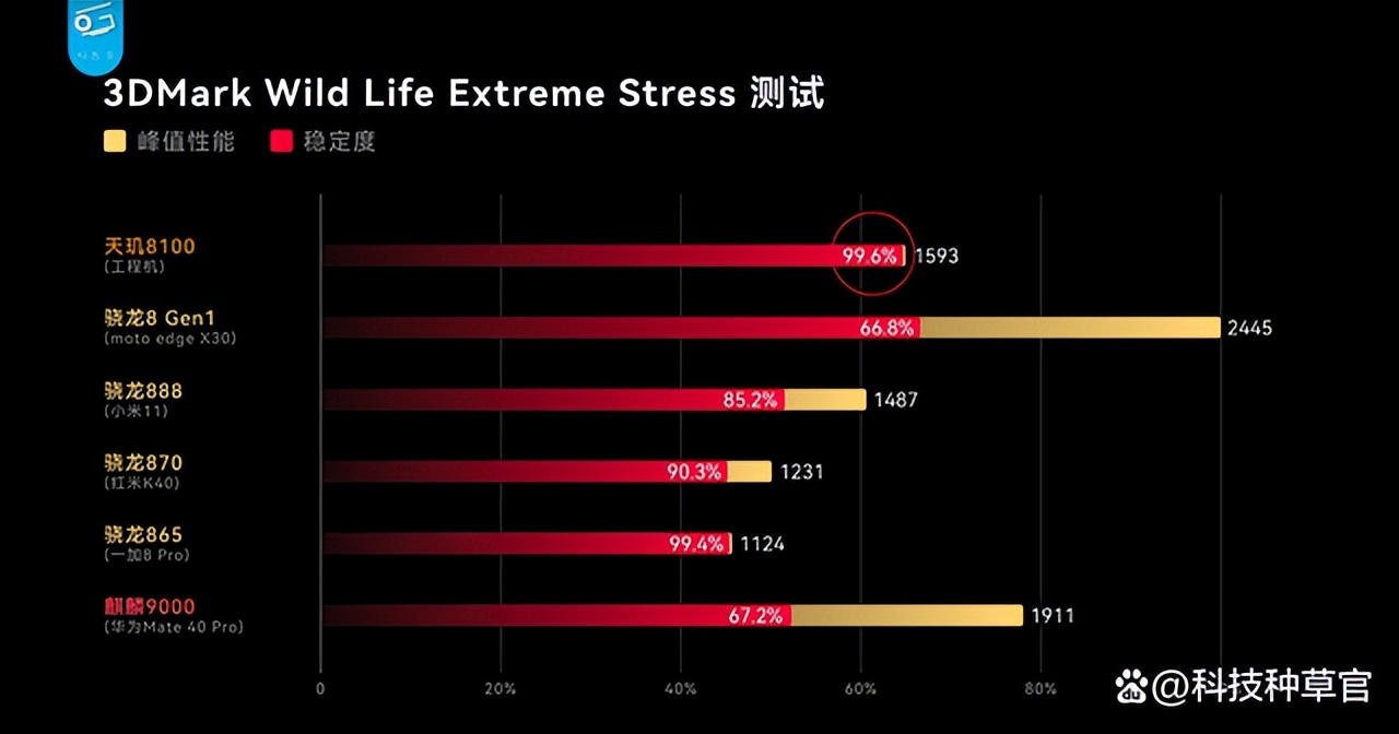 天玑8100进行了3DMark的Wildlife Extreme Stress测试,成绩达到了1593分,超越骁龙888。此外,天玑8100稳定度测试成绩达到了惊人的99.6%稳定度,远超骁龙8Gen1。