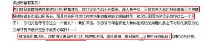 信中有句原话是这么说的:你们父亲气焰十分嚣张,恶人先告状,不仅状告为我们村民声张正义的詹桥镇镇长和派出所所长,而且状告所有世代农耕为生的善良的上畈组村民。