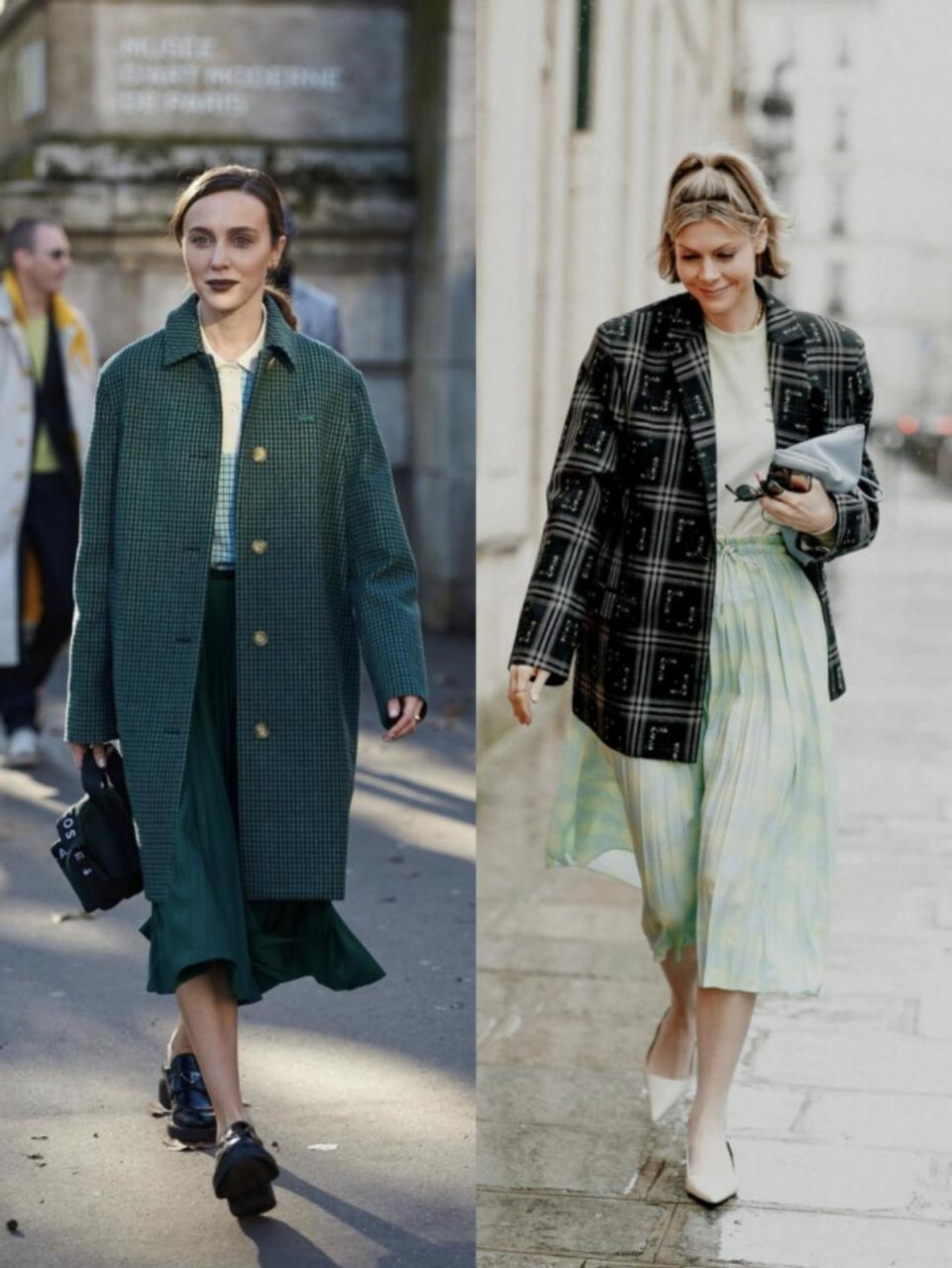 格子的外套当然也可以和半身裙进行扒皮狼,那么半身裙就建议选择较为宽松的板型,而且材质尽量选择垂坠感较强或者十分轻薄的材质。