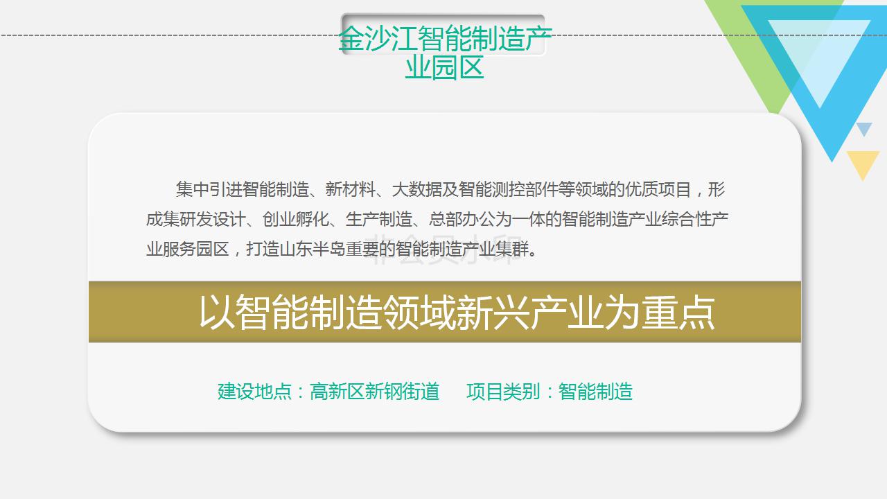 以智能制造领域新兴产业为重点,集中引进智能制造、新材料、大数据及智能测控部件等领域的优质项目,形成集研发设计、创业孵化、生产制造、总部办公为一体的智能制造产业综合性产业服务园区,打造山东半岛重要的智能制造产业集群。