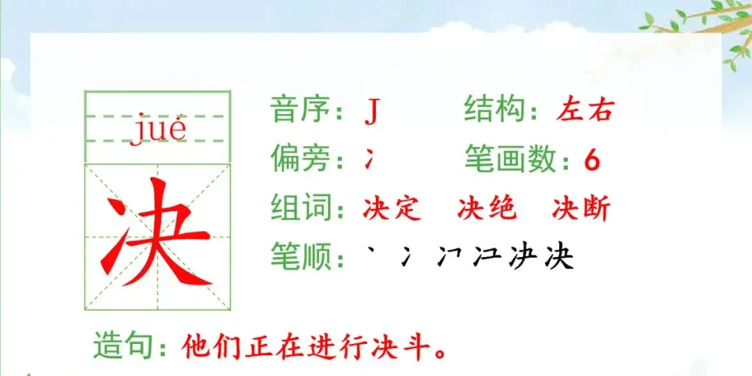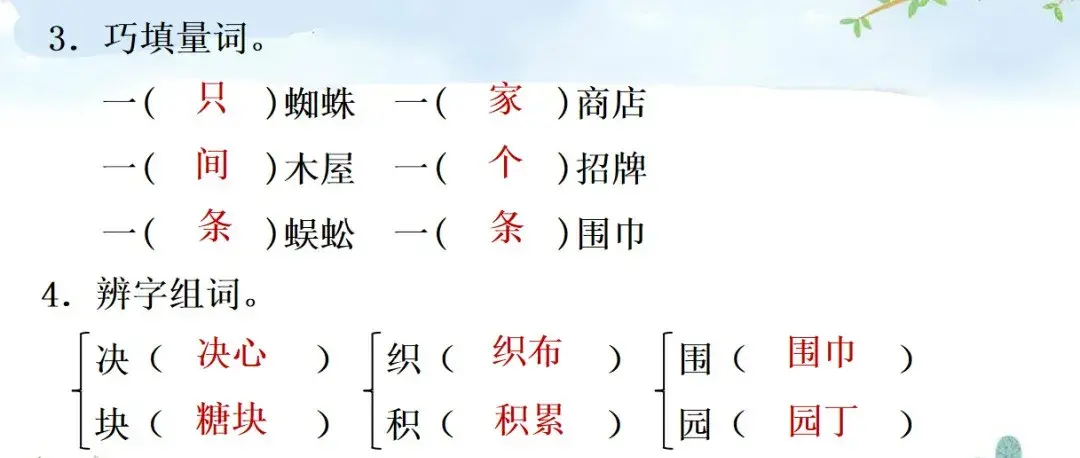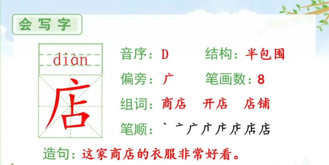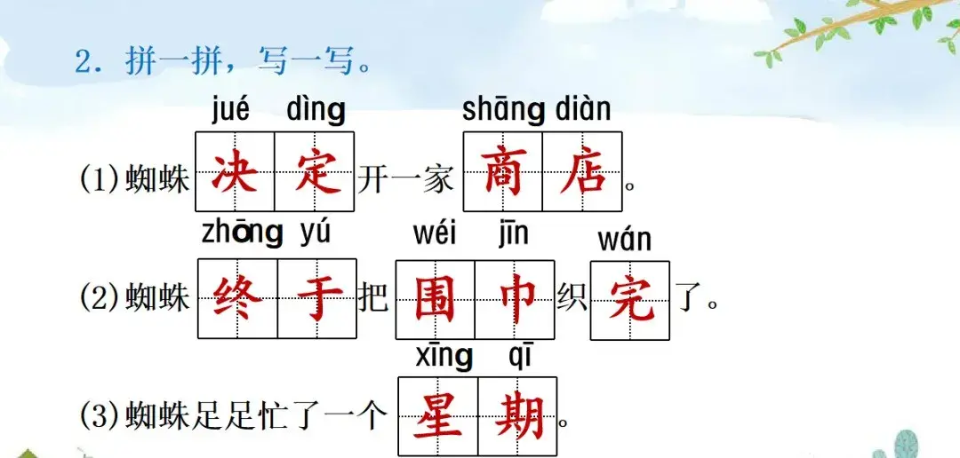 1. 认识店、蹲等15个生字,会写店、决等9个字,会写飞虫、决定等8个词语。