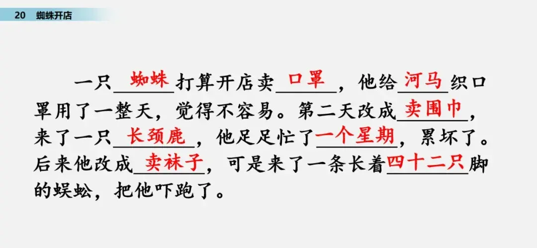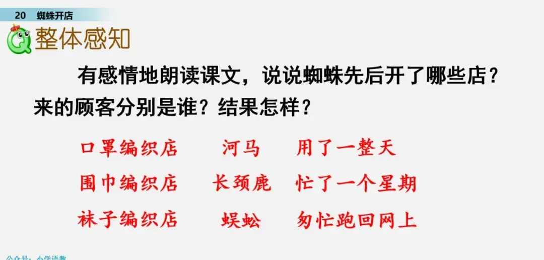 蜘蛛开口罩编织店来了河马,蜘蛛用了一整天才织完口罩;蜘蛛开围巾编织店来了长颈鹿, 蜘蛛忙了一个星期才织好围巾;蜘蛛开袜子编织店来了蜈蚣,蜘蛛吓得跑回了网上。
