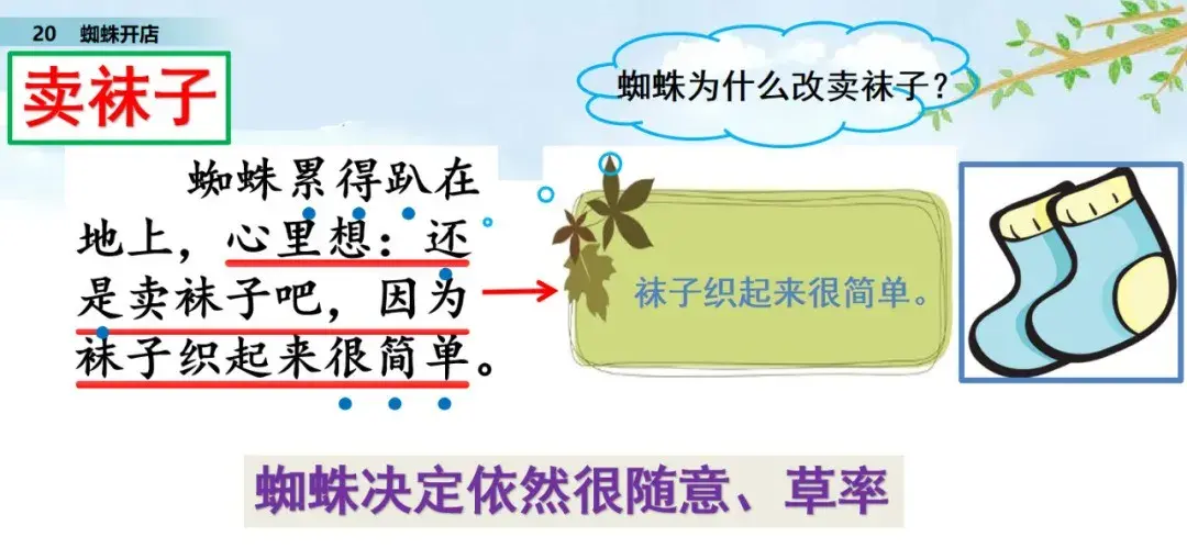 文中3 处直接描写了蜘蛛的想法:卖什么呢?就卖口罩吧, 因为口罩织起来很简单。晚上, 蜘蛛想:还是卖围巾吧,因为围巾织起来很简单。蜘蛛累得趴倒在地上,心里想:还是卖袜子吧,因为袜子织起来很简单。从以上蜘蛛的想法中,我们看到都有很简单这个词,可见蜘蛛根本没有认真考虑过卖什么,什么简单他就织什么。