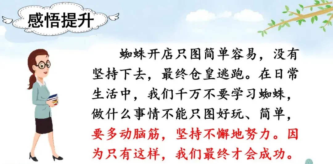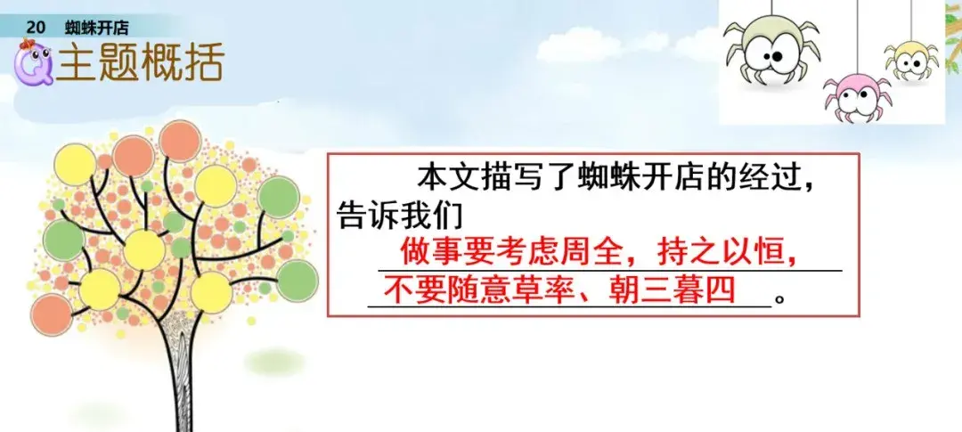 本文语言通俗易懂,通过蜘蛛开店的故事,告诉我们无论做什么事情都不能只图简单,要持之以恒的道理。