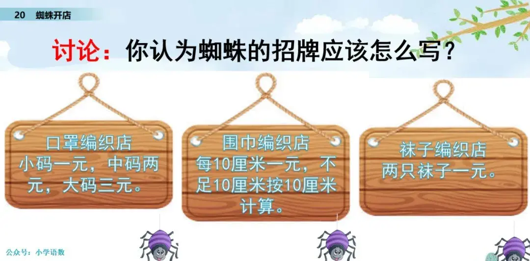 2.蜘蛛的招牌上都写了什么?你认为招牌这样写对吗?应该怎么写?