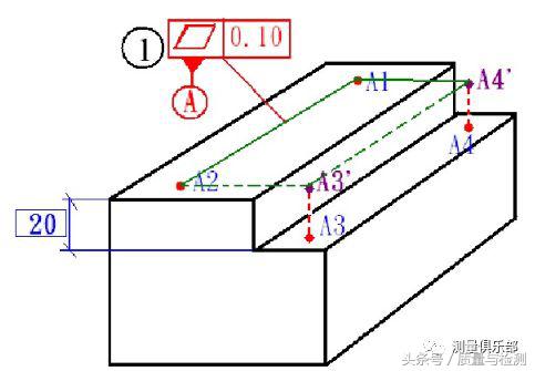 3:下图中基准A由A1,A2,A3,A4四点构成,测量A基准面(既Dim1)的平面度.