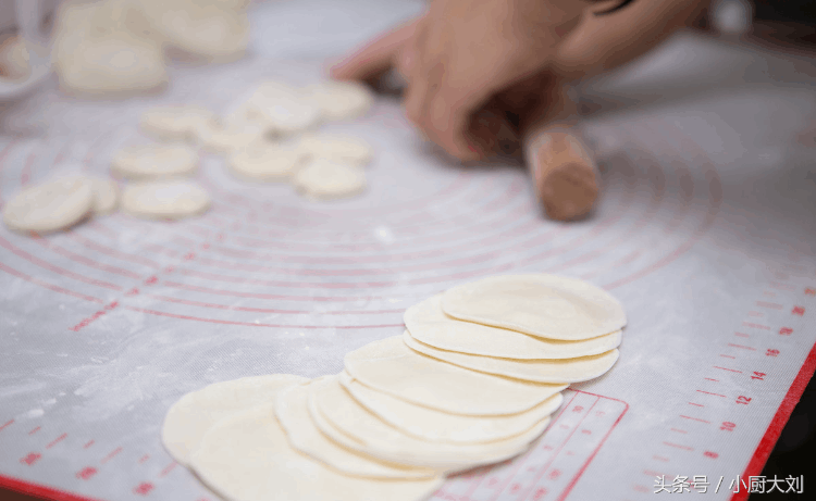 第六步:擀皮。阿婆说擀饺子皮用力要均匀,使饺子皮的大小、厚度形状均匀一致,具体的标准就是中间厚边缘薄(中间厚防止饺子馅漏,边缘薄吃起来口感好)。擀皮时注意右手均匀用力推压,左手转动面剂角度一致,即可保证擀处出的饺皮大小、形状、薄厚一致漂亮。
