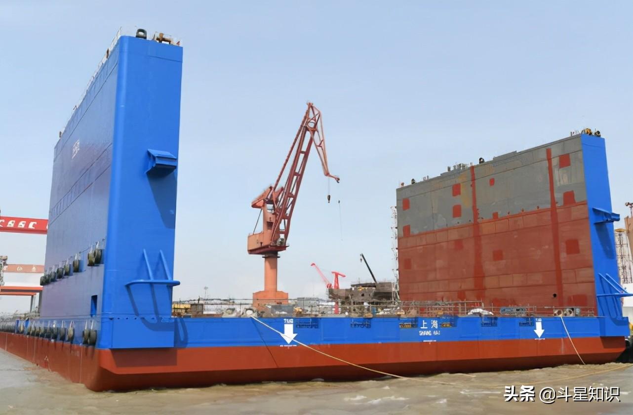 我国的江南造船厂为了进一步提升第二艘国产航母的建造速度,成功研制出了型长256米,型宽60米,型深7米,设计吃水4.8米,尾塔楼顶甲板至基面28.9米、首塔楼左舷顶甲板至基面30.6米,最大沉深21米,最大举力3.2万吨的长兴八号浮式作业装置。舭部一共12个海底门,底部设置40个压载舱,舱容101000立方米,配备了10台超大排量的压载泵,每个泵每小时最大排量为4500立方米,实现快速调整压载水、快速升降。采用阀门遥控等先进技术,实现中央控制室遥控操作,自动化程度极高。