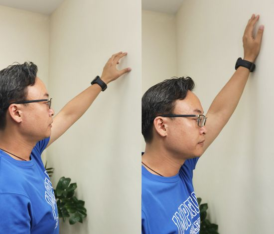离墙一尺侧身站立,患肢从低往高向上爬墙,还可以站立在门或单杠旁,尽量抬臂,双手往上够,在够到的位置划一条线,以后每次尽量达到这条线或是更高的位置。
