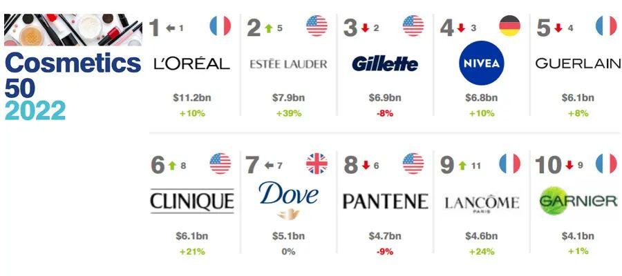 英国品牌评估机构品牌金融(Brand Finance)发布2022全球化妆品和个人护理品牌价值50强排行榜(Cosmetics 50 2022)。欧莱雅、雅诗兰黛和吉列排名前三位。50个品牌总价值为1307亿美元。美国宝洁公司、英国联合利华集团和法国欧莱雅集团的品牌上榜最多。