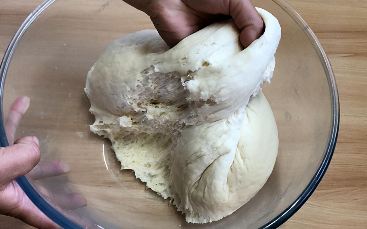 第二步:大碗里准备500克普通面粉,用酵母水和面,和成絮状再下手揉面,充分揉匀后,揉成不软不硬光滑的面团;然后盖上盖子醒发至两倍大,视频中醒发了一个小时,发酵好了之后手指戳洞不回缩,拉开有丰富的蜂窝组织。