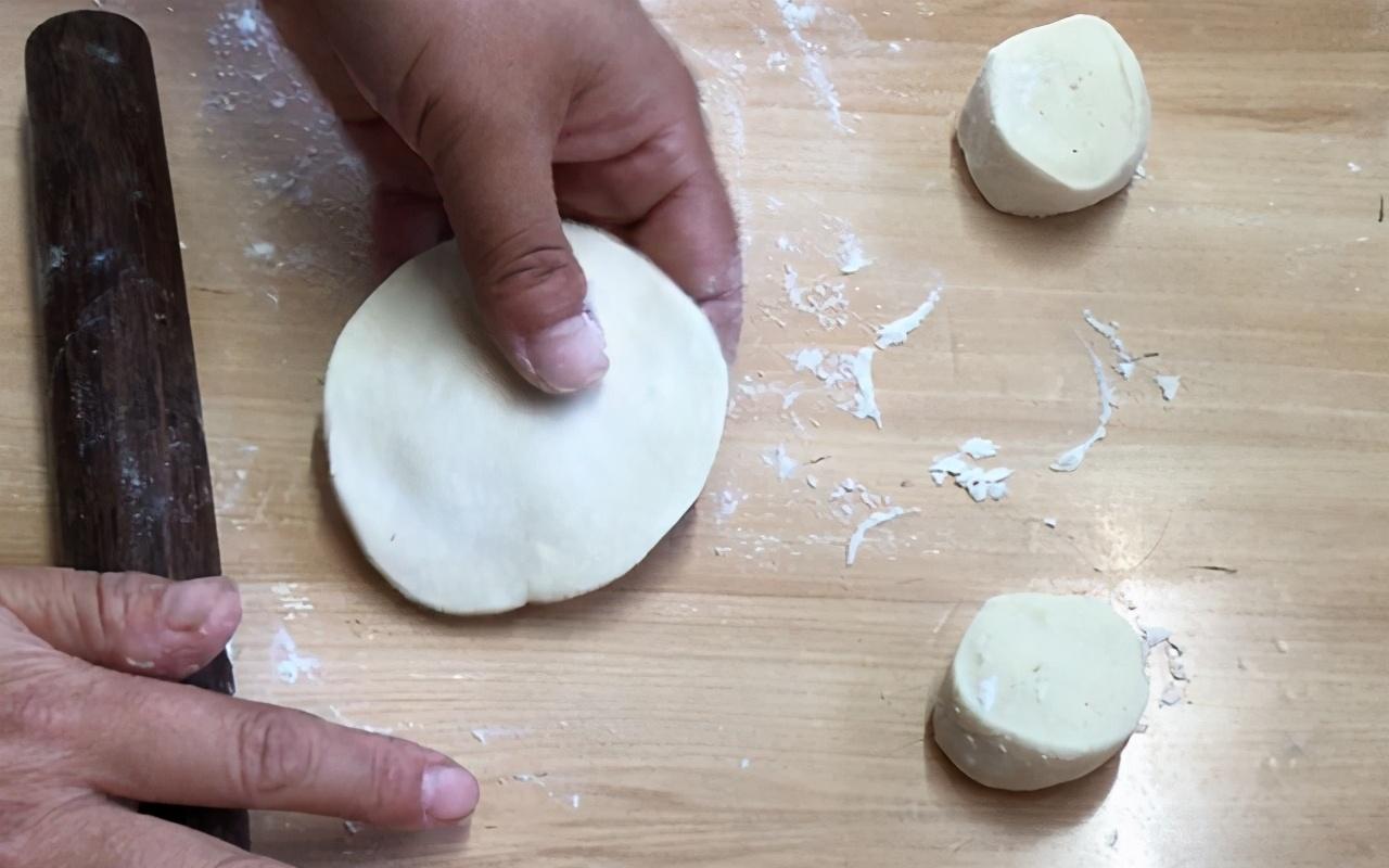 第1步:把一个稍大的剂子擀成圆饼,接着在饼上抹点油,并撒上少许食用盐,然后用刀把饼切成四等份备用。