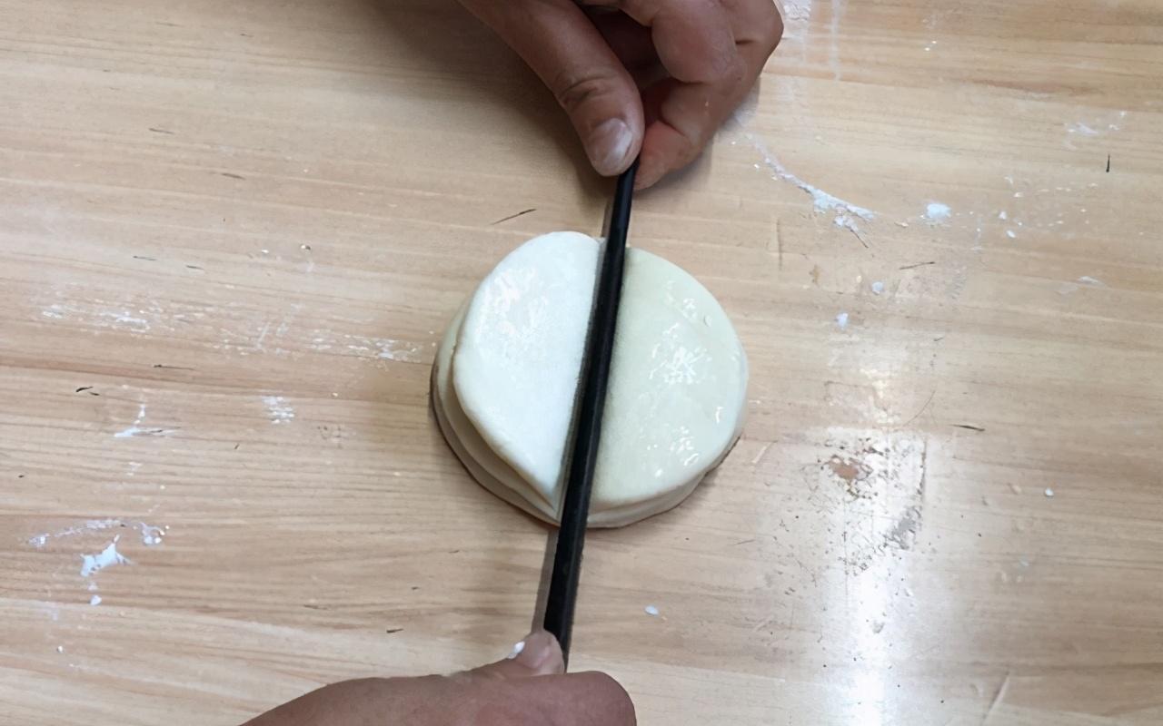 第2步:把三张皮子重叠好,再用筷子从中间压一下;