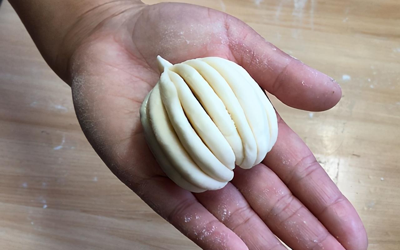 第4步:把皮子再次沿着上一步中按压的痕迹翻折,然后反过来把尾巴捏紧后,再次用筷子压下来,一个花卷就做好了。