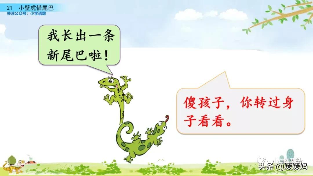 小壁虎把借尾巴的事告诉了妈妈。妈妈笑着说:傻孩子,你转过身子看看。小壁虎转身一看,高兴得叫了起来:我长出一条新尾巴啦!