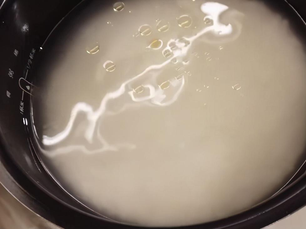 先把米饭蒸上,老厨师讲得非常详细,这米饭想要做得好吃,洗大米的时候,一定要把淀粉洗干净,就用手淘洗就可以,不可以搓,洗米水很清亮的时候就可以了,然后放入1:1.5的纯净水,这里有一个小窍门,滴入几滴食用油,然后再开启电饭煲开始蒸。