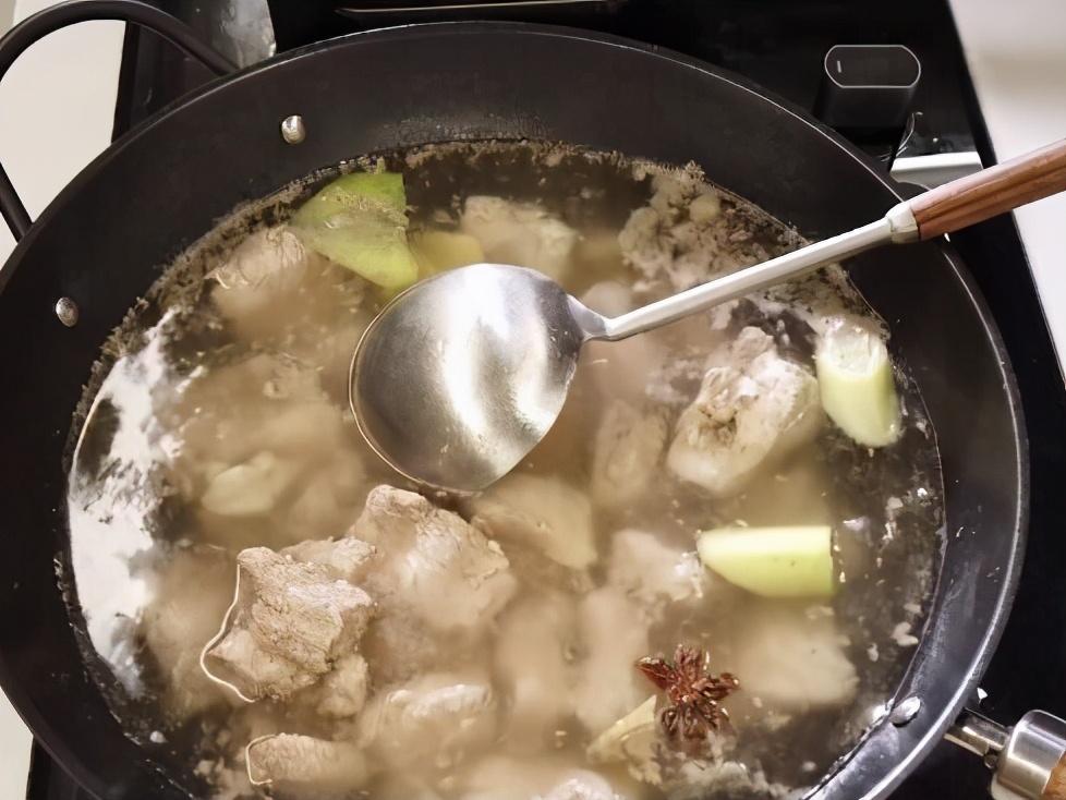 水开漂出浮沫,然后继续煮几分钟,之后把排骨捞出,用热水清洗,洗干净控水备用。先准备一个锅烧适量水,一会炖排骨用,另起锅烧油,热锅凉油,油少放一点,因为排骨还会出油,加入葱段、姜片、桂皮、花椒、八角,炒香,加入洗净排骨块,翻炒一下,加入冰糖老抽和酱油调色,用冰糖老抽就不用炒糖色了,然后继续翻炒,均匀上色之后,加入热开水,大火烧开,炖十分钟或者十五分钟,加入适量胡椒粉和盐,时间充裕的,可以继续用小火炖一个半小时。