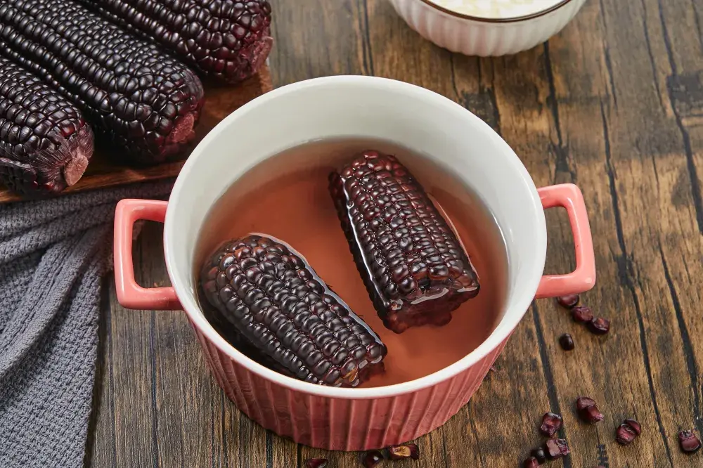 注意哦,黑玉米因为花青素含量极高,水煮时可能会出现掉色的情况,其实是水煮让玉米中的天然植物色素-花青素渗透出来了,是正常的哦!