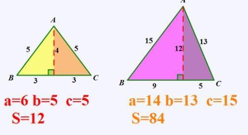 很明显,海伦公式带有根号,因此,对于许多三角形即使三边是整数,其面积却是无理数。(当时,人们还未认识无理数)。而海伦在其著作中举出一个特殊的案列:a=13,b=14,c=15,S=84.