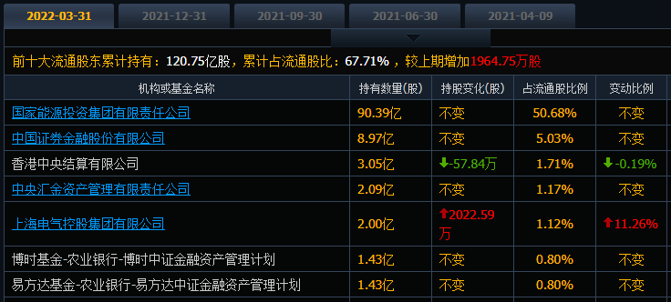 从上市公司的经营数据上找不到股价上涨的原因,那么只能在其股票交易层面上探寻究竟了。在国电电力的前十大流通股东上,它从2021年第四季度开始,这一数值就在增加了。