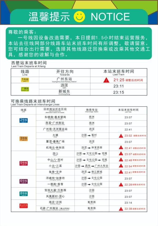 改造当天,受一号线提前结束运营服务影响,其他线路车站去往线网部分线路车站末班车时间也会相应提前。