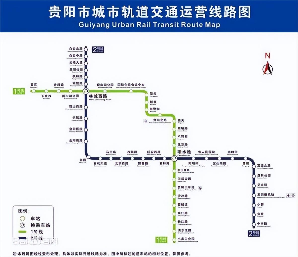 贵阳轨道交通首条线路于2017年12月28日开通试运营。截至2021年4月,贵阳轨道交通开通运营线路共有2条,即贵阳轨道交通1号线、贵阳轨道交通2号线,线路长度75.71千米,共有57座车站。
