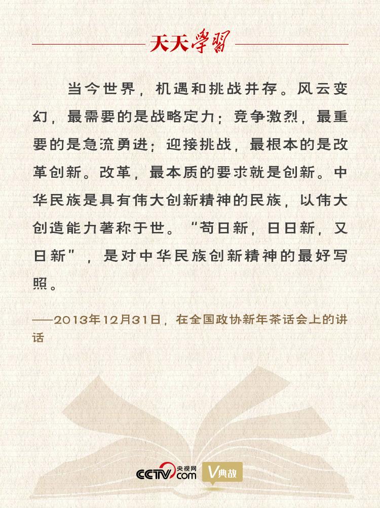 每逢重要场合,习近平总书记都要谈改革、谈创新。他曾多次引用苟日新,日日新,又日新这句古语,强调创新是民族进步的灵魂,是一个国家兴旺发达的不竭源泉,也是中华民族最深沉的民族禀赋。生活从不眷顾因循守旧、满足现状者,从不等待不思进取、坐享其成者,而是将更多机遇留给善于和勇于创新的人们。在党的十八届五中全会上,习近平总书记提出创新、协调、绿色、开放、共享新发展理念,其中创新居于五大发展理念之首。