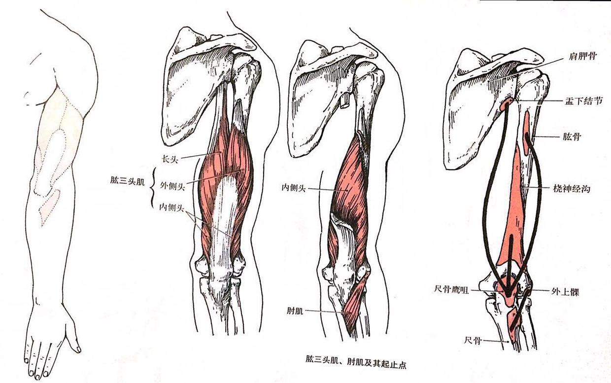 肱三头肌的起端有3个头:长头起自肩胛骨的盂下粗隆;外侧头和内侧头都起自肱骨的背面,向下,3个头共续于一个腱,止于尺骨鹰嘴。主要功能是伸前臂和伸肘。