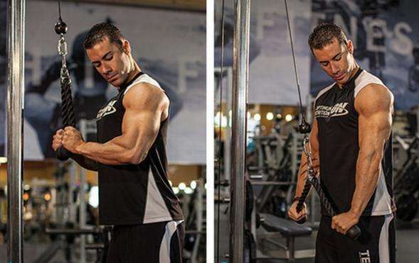 锻炼肱三头肌长头,多做臂屈伸类动作,双杠臂屈伸、哑铃和杠铃臂屈伸;锻炼肱三头肌外侧头多做下压类动作,比如直杆或绳索下压;锻炼肱三头肌内侧头多做推举类动作,比如窄握杠铃推举。肱三头肌是小肌群,做任何动作时都能锻炼到整个肱三头肌,只不过不同动作对三个头的锻炼各有侧重,锻炼时至少做3个各有侧重的动作,再有选择的做一个三个头中第一个有侧重性的加强锻炼。长头是必练部位,也是重点锻炼部位,其次是外侧头,最后是内侧头。