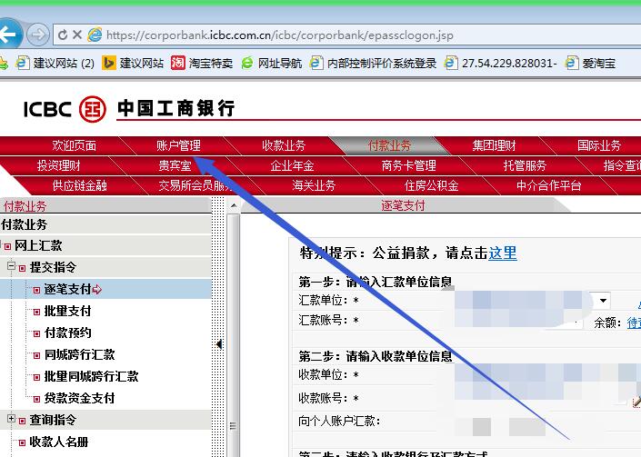 完成登录后,用户点击下图蓝色箭头所指处的【我的账户】或是【账户管理】选项,进入到下一步骤。