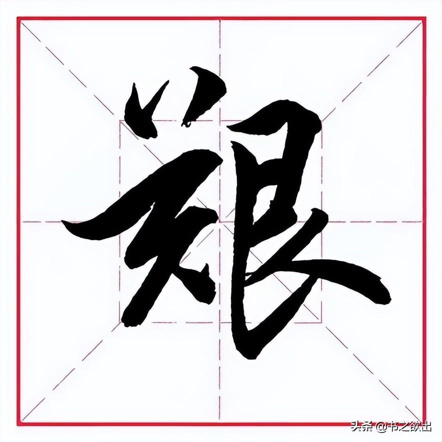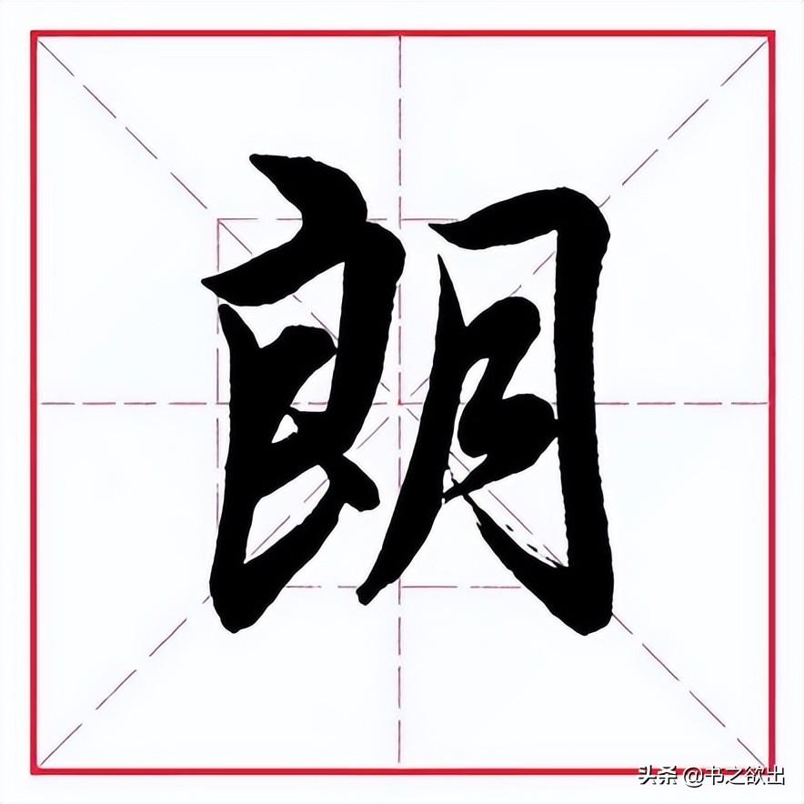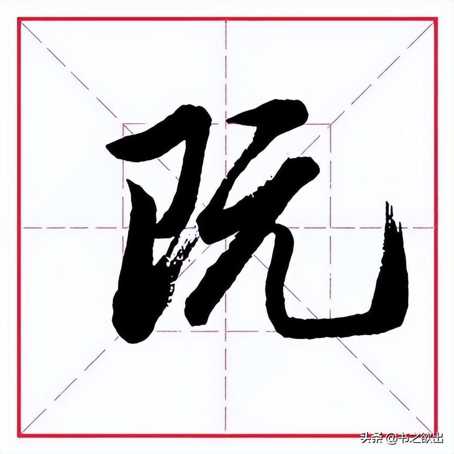 首笔横折以露锋斜切入笔,然后向右稍抗肩上行,行笔略轻,到转折处再折笔向左下行,行笔略长;中间点笔布白均匀,收笔呼应下画;下横抗肩与上横一致,且收笔托住右竖;竖提起笔与横折留有气口,中间略轻,稍带弧度,行笔到位后再折笔向右上方出锋写提;撇笔与反捺连写,上紧下松,捺笔角度略平,末端稍作回锋收势。