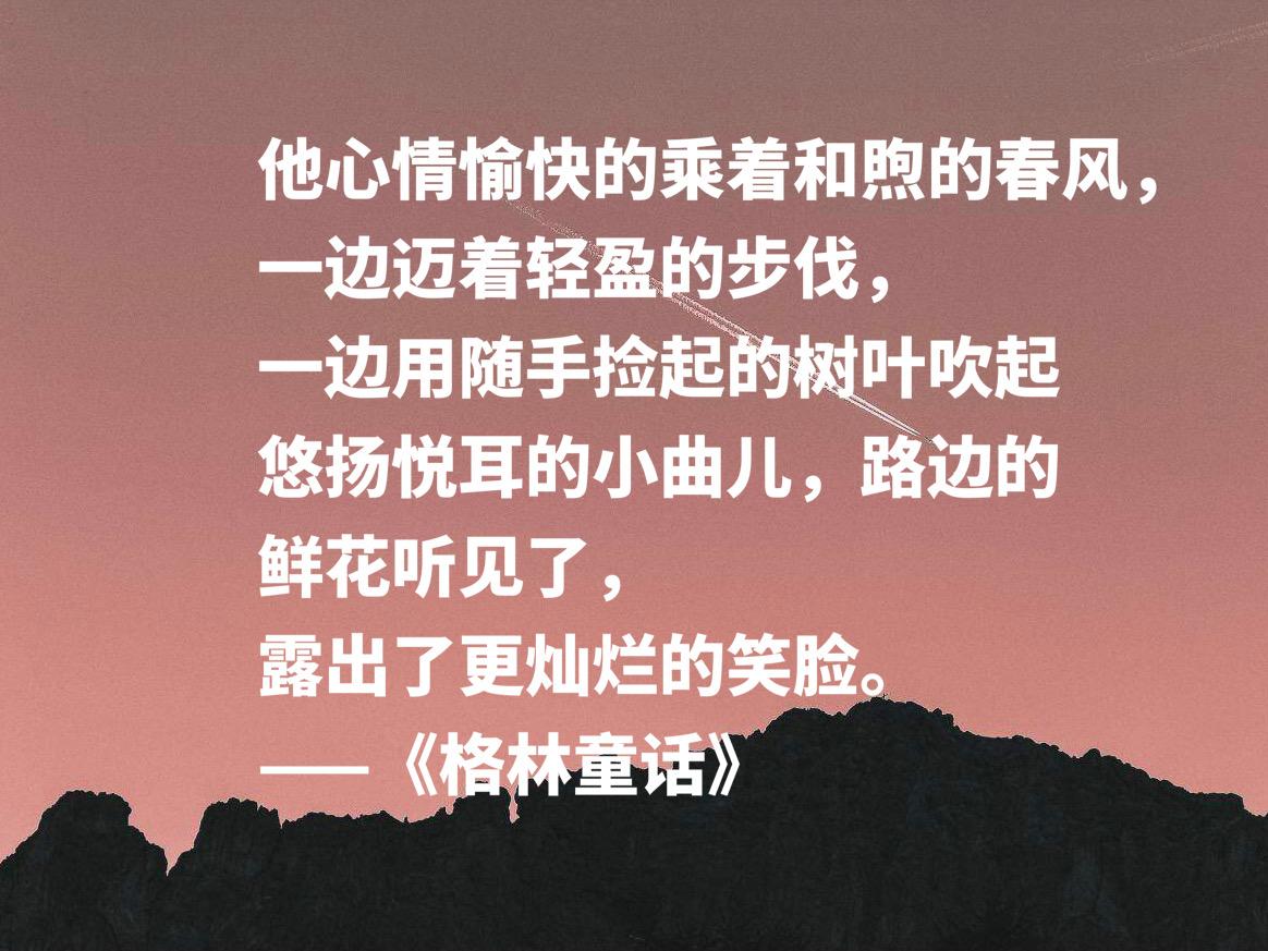 他心情愉快的乘着和煦的春风,一边迈着轻盈的步伐,一边用随手捡起的树叶吹起悠扬悦耳的小曲儿,路边的鲜花听见了,露出了更灿烂的笑脸。——《格林童话》