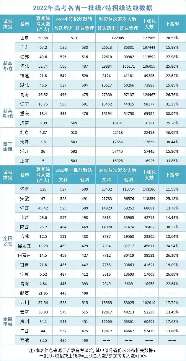 从整体数据来看,特招线(一本)达线率最高的为北京市,2022年高考报名人数5.47万,实考人数4.87万人,达线总人数22413,达线率46.02%,达线率最低的为河南,本科一批达线率11.93%;