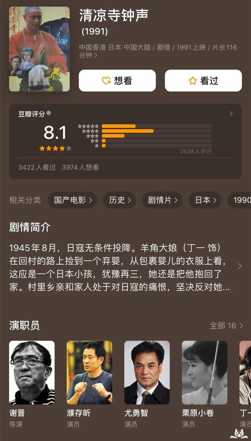 影片介绍:从某种意义上来讲《清凉寺钟声》不单纯是一部佛教电影,宏观背景下这是一部关于国家抗侵略史的电影,故事上则是一部关于家庭、个人成长的电影。最终,电影通过多个维度的铺垫,折射出中国人人性里最善良的角落。