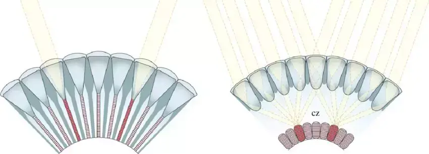 昼行性昆虫的复眼主要为并列型象眼,每个小眼的光感受器仅接收入射到该小眼的光线。