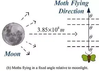 当飞蛾以为路灯就是月亮时,它就会试图以与光线呈45°的夹角飞行。