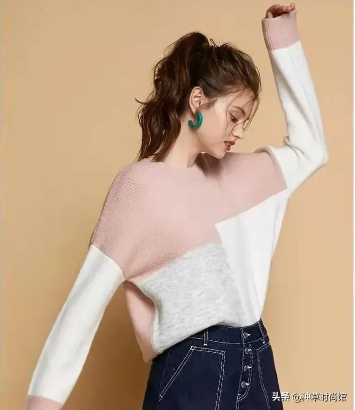 不仅如此,还有一些比较特别的服装设计也很吸引我,比如这件撞色的针织衫,分块的范围和颜色都不规则,虽然颜色浅、差异不明显,但依然能展现出个性。